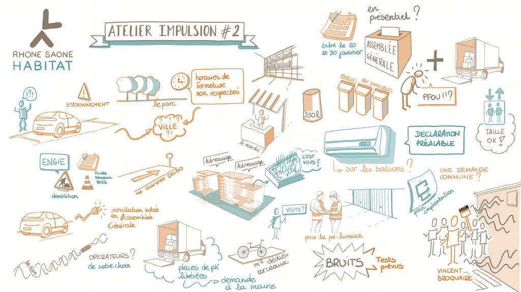 La résidence Impulsion située au cœur du quartier de Villeurbanne La Soie, sera livrée en début d’année 2021. C’est pourquoi RHONE SAONE HABITAT a organisé un événement en visio à destination des futurs habitants. Un temps pour préciser l’avancée du chantier, présenter ce qu’est le syndic ainsi que la démarche artistique de Vincent Broquaire. Une soirée animée par l’Atelier Pop Corn et en présence de Valérie Simoncelli, dessinatrice et illustratrice.