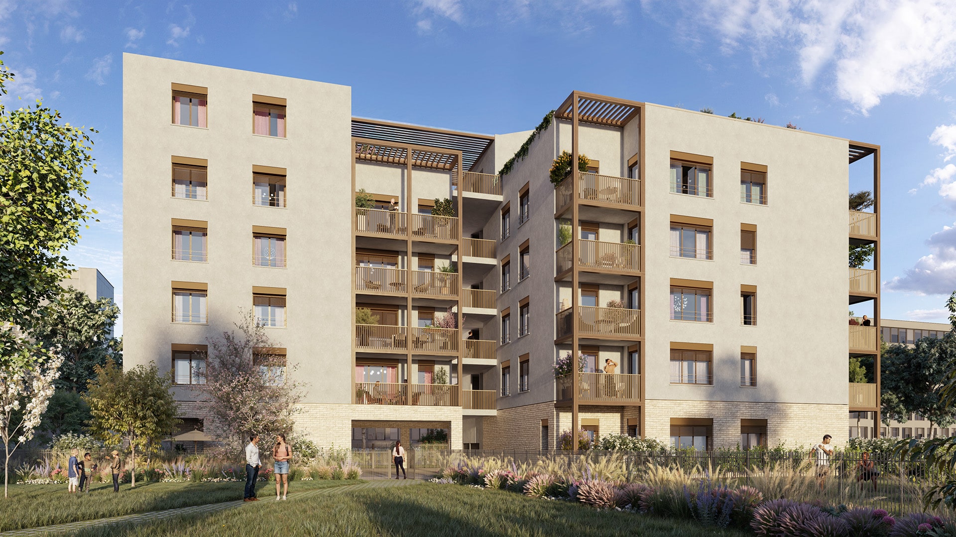 Pensée comme la suite naturelle du programme « L’Entracte », la résidence Acte II marque l’achèvement d’un grand îlot urbain organisé autour d’un jardin collectif très généreux. Conçue par le cabinet Supermixx, l’architecture utilise un procédé mixte associant béton bas carbone et bois pour un confort thermique optimisé.